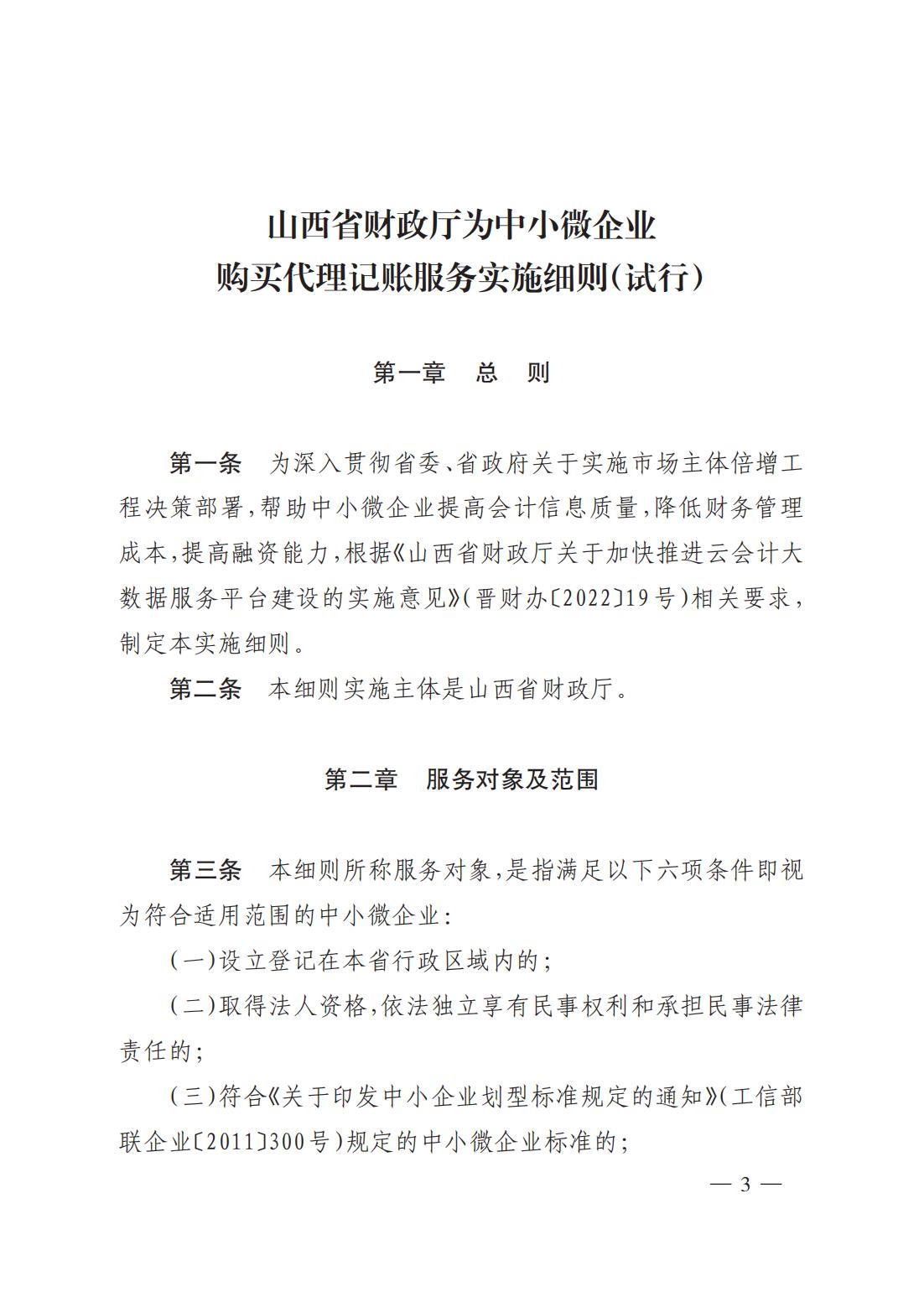 關(guān)于印發(fā)《山西省財(cái)政廳為中小微企業(yè)購(gòu)買代理記賬服務(wù)實(shí)施細(xì)則(試行)》的通知